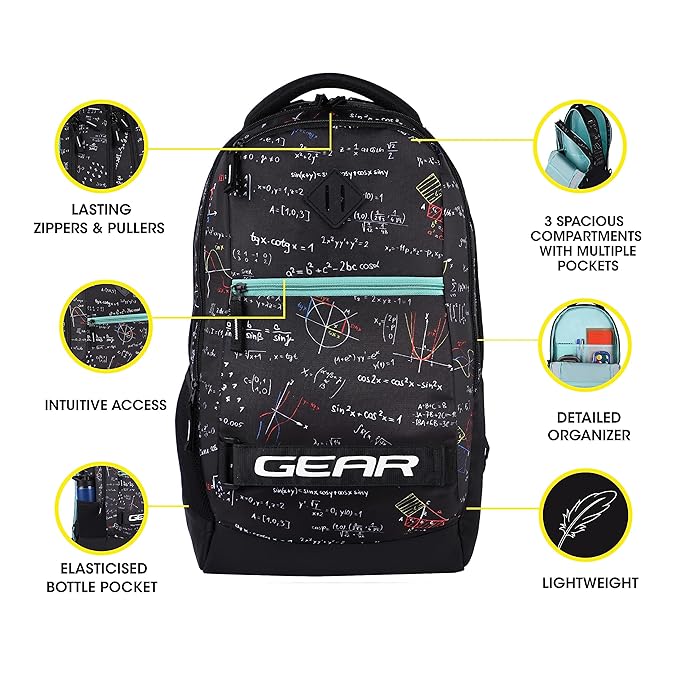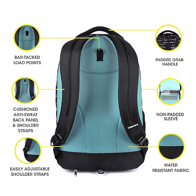 • Ergonomic Design : Intuitive Access: 3 Spacious Compartments with Multiple Pockets : Internal Organizer : Non-Padded Sleeve : Water Resistant Fabric : Lightweight : Bar-Tacked Load Points : Durable Long Lasting Zippers & Pullers : Easily Adjustable Shoulder Straps : Elasticised Bottle Pocket : Cushioned Anti-Sweat Back Panel & Shoulder Straps : Padded Grab Handle : Rain Cover in Zippered Bottom Pocket